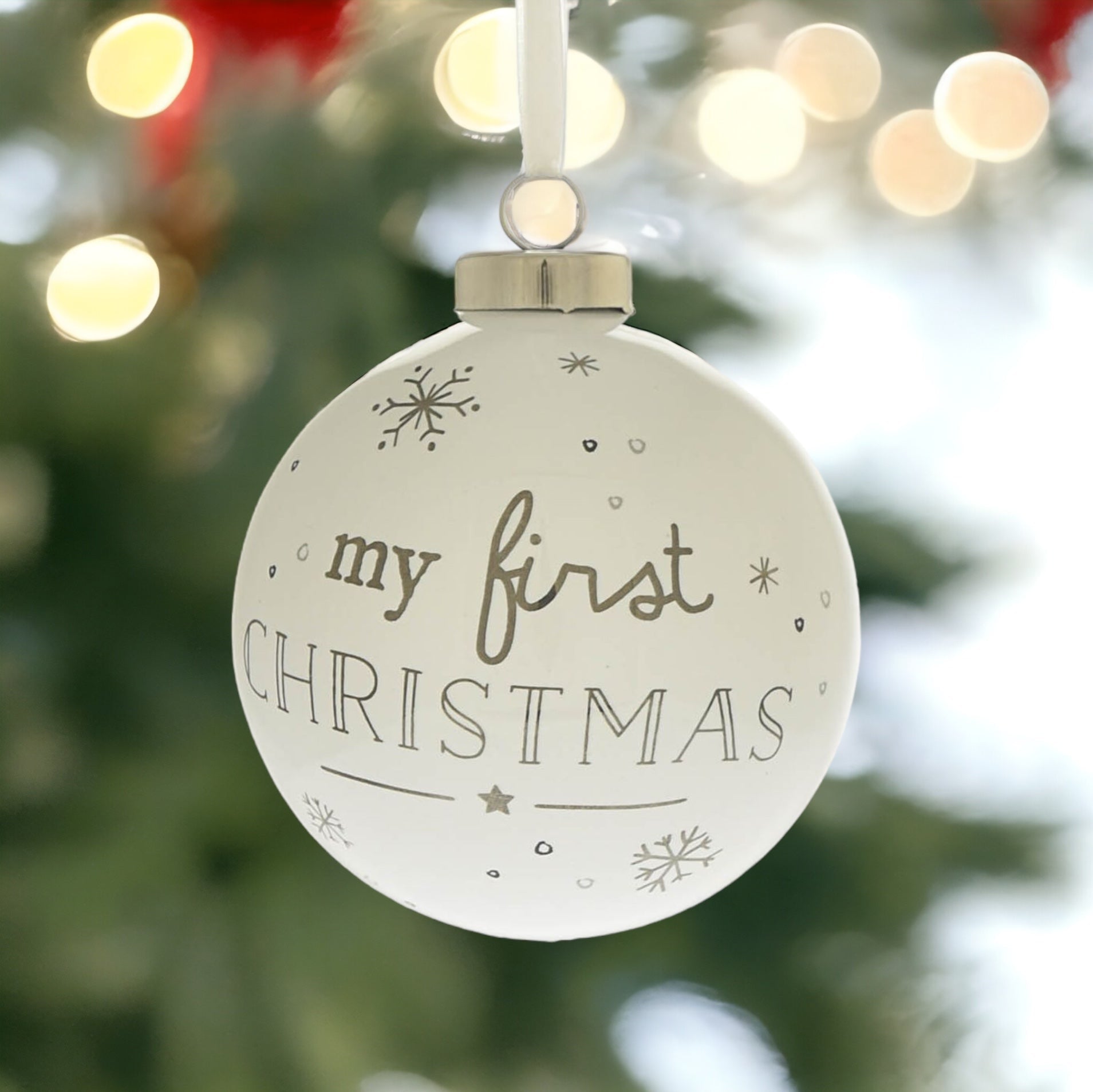 The reverse showcases ‘My First Christmas’ sentiment in distinct silver lettering, which is finished by further silver snowflake decoration and matching white ribbon for tree hanging.